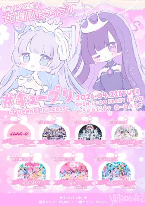 LIVE 概要 タイトル 『HEROINES主催 女性限定LIVE #キュープリ -Queen &Princess -』 開催日 2026年4月21日 場所 Spotify O-EAST 出演 サポート:かのん のんふぃく! / iON! / MEGAFON / ドレスコード / ラストシーン / TENRIN / パラディーク LIVE 動... -