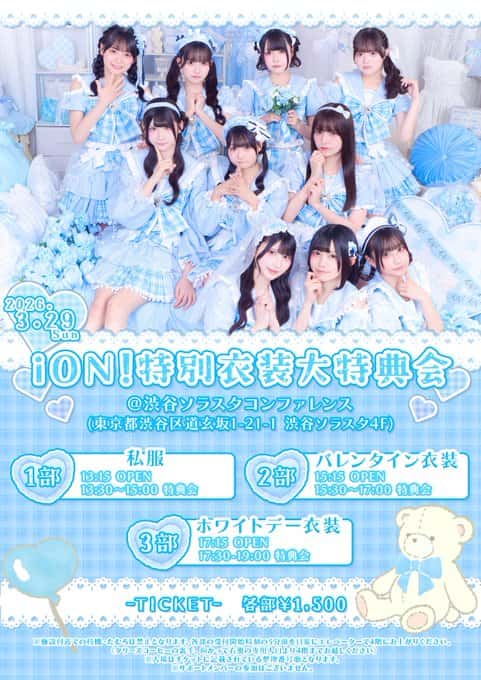 LIVE 概要 タイトル 『iON!特別衣装大特典会』 開催日 2026年3月29日 場所 渋谷ソラスタコンファレンス 出演 iON! スケジュール 1部 :私服 13:15-OPEN 13:30-15:00 特典会 2部 :バレンタイン衣装 15:15-OPEN 15:30-17:00 特典会 3部 :ホワイトデー衣装 ... -