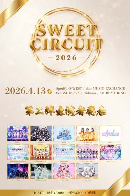 LIVE 概要 タイトル Sweet Alley presents『SWEET CIRCUIT 2026』 開催日 2026年4月13日 場所 渋谷 出演 LIVE 動画 LIVE セットリスト LIVE SNS LIVE 画像 LIVE みんなの投稿 -