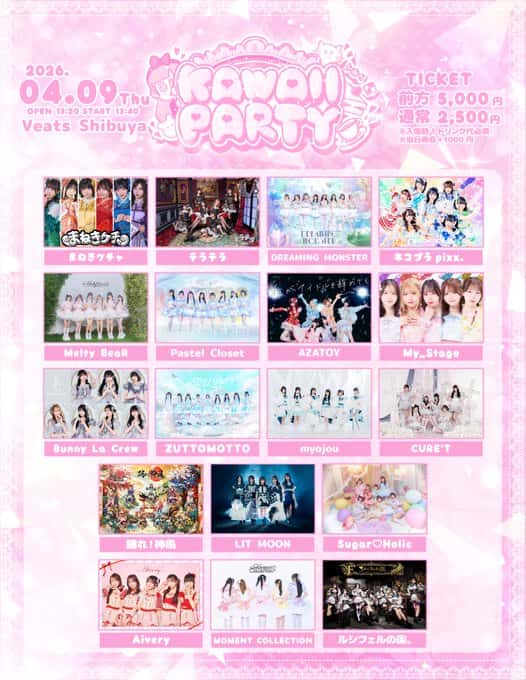 LIVE 概要 タイトル 『KAWAII PARTY』 開催日 2026年4月9日 場所 Veats Shibuya 出演 まねきケチャ / ネコプラpixx. / DREAMING MONSTER / Melty BeaR / Pastel Closet / AZATOY / My_Stage / Bunny La Crew / ZUTTOMOTTO / myojou / CURE'T / 踊れ!神風 ... -