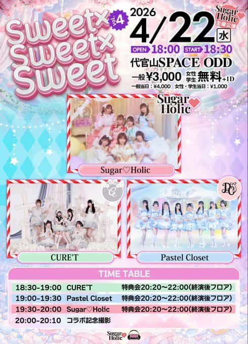 LIVE 概要 タイトル 『Sweet × Sweet × Sweet vol.4』 開催日 2026年4月22日 場所 代官山SPACE ODD 出演 Sugar♡Holic / CURE'T / Pastel Closet LIVE 動画 LIVE セットリスト LIVE SNS LIVE 画像 LIVE みんなの投稿 -